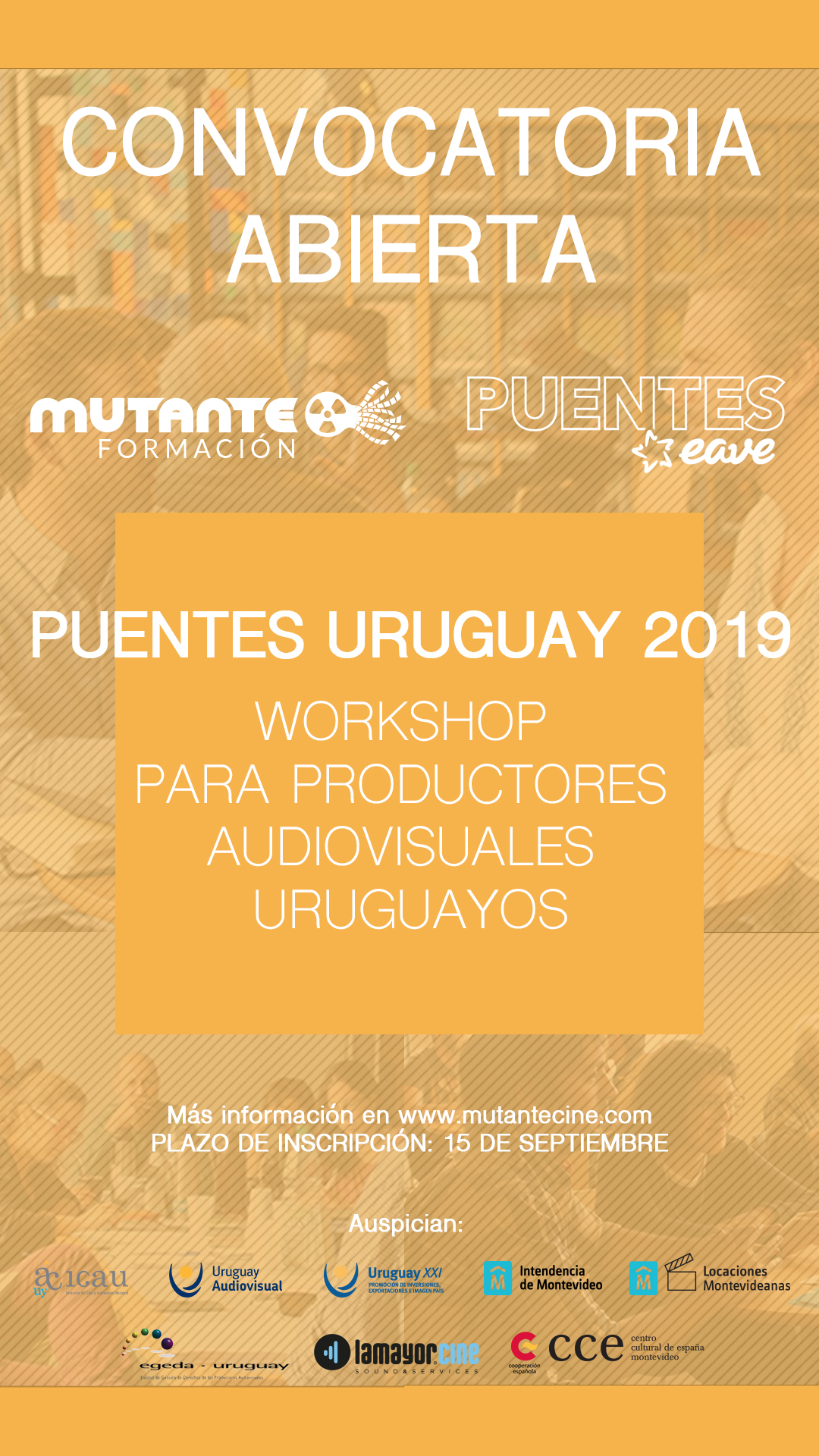 Mutante Cine y EAVE (European Audiovisual Entrepreneurs) convoca al séptimo Workshop Puentes Uruguay 2019/Eave On Demand, que se llevará a cabo entre el 27 de Noviembre y el 2 de Diciembre próximos en Montevideo.